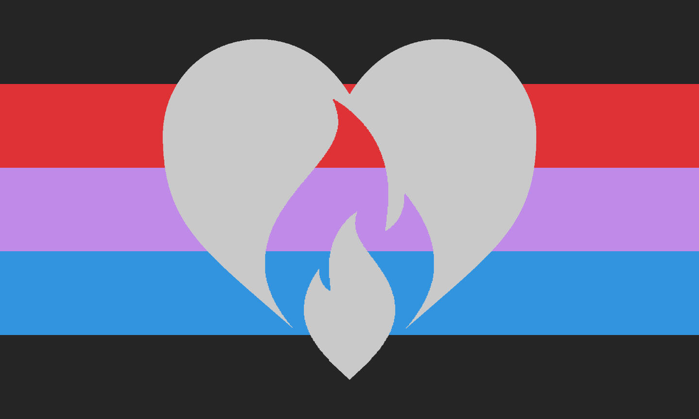 [ID: The hearthic flag. It had five stripes. From top to bottom, they are dark gray, red, purple, blue, and dark gray. There is a light gray symbol in the middle that resembles a heart with a flame inside it. End ID]The hearthic flag is dark gray for a feeling of place, red for the coziness of the hearth, purple for longing, and blue for the peace the feeling of home can bring.